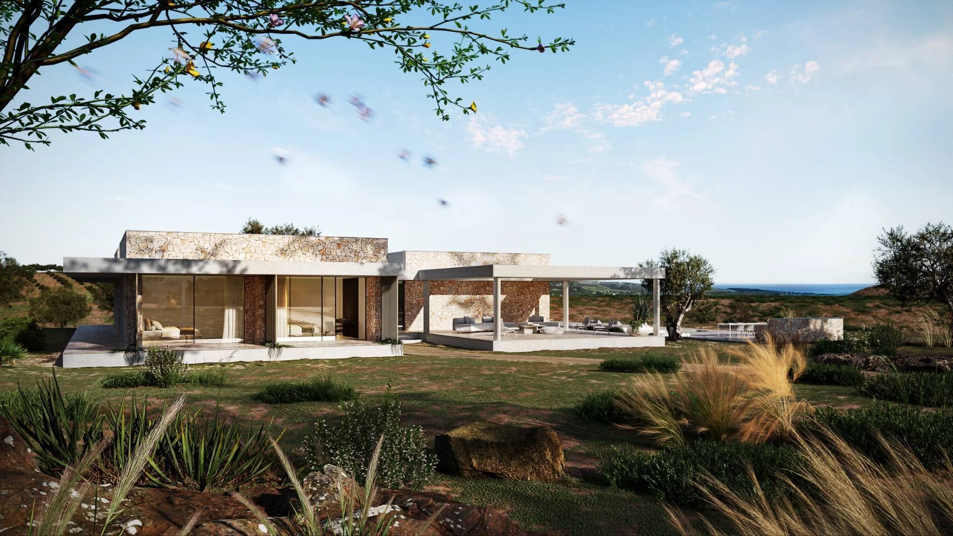 Villa Aura, with its snow-white stone, glistens in the sun, offering a spacious and clean architectural design. This prestigious villa features large windows that let in gentle sunlight, highlighting the authenticity of the landscape.