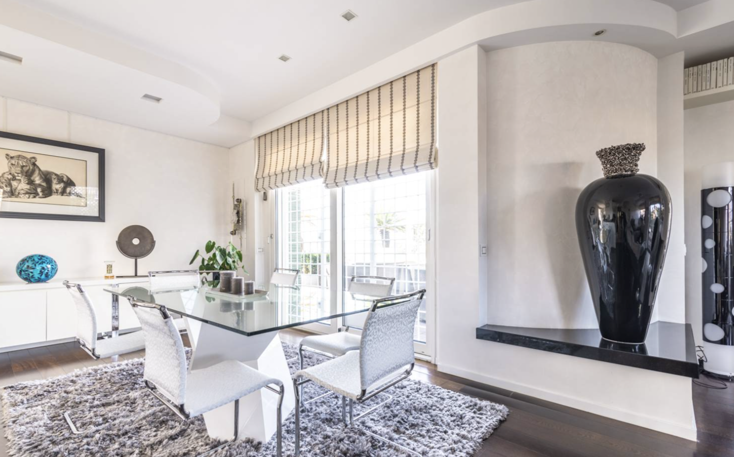 This prestigious penthouse is located in the residential district of Via Cortina D'Ampezzo, in Via Courmayeur.